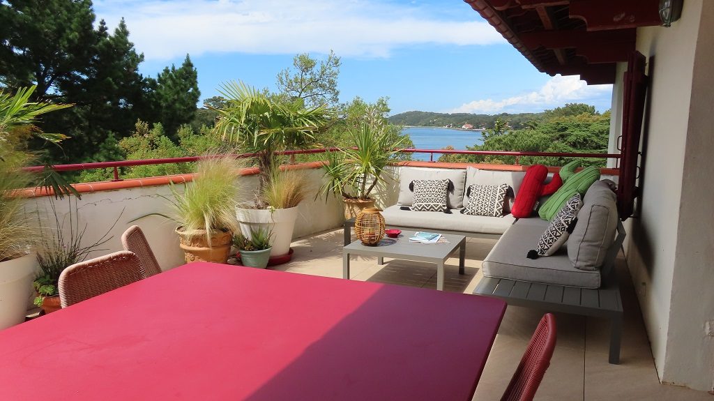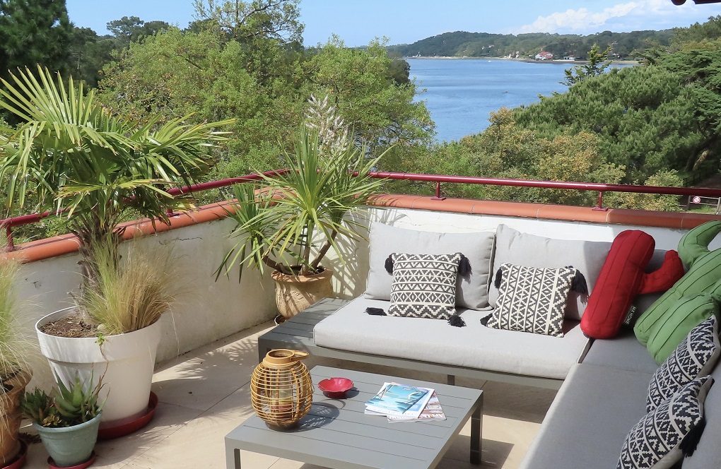 Son point fort est une magnifique terrasse de 50m² triple orientation ouest, sud, nord qui permet d'y prendre tous les repas et se relaxer à l’ombre ou au soleil avec une vue époustouflante sur le lac marin et le canal.