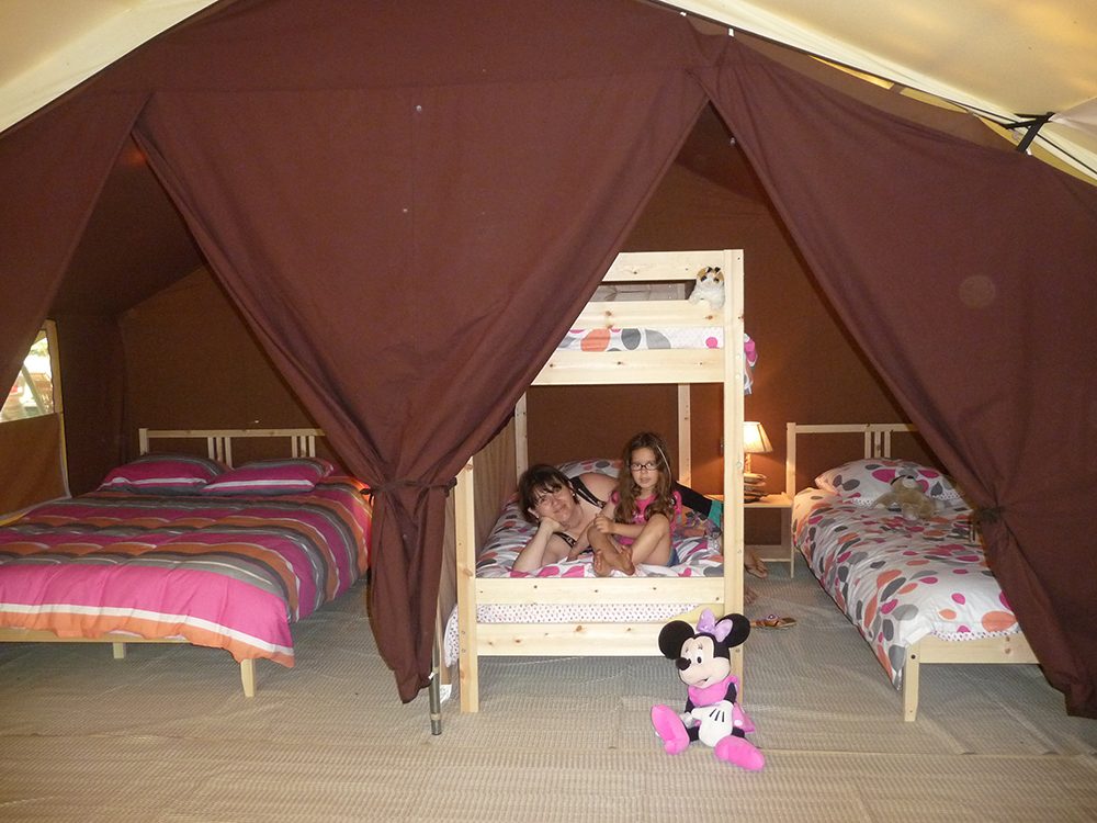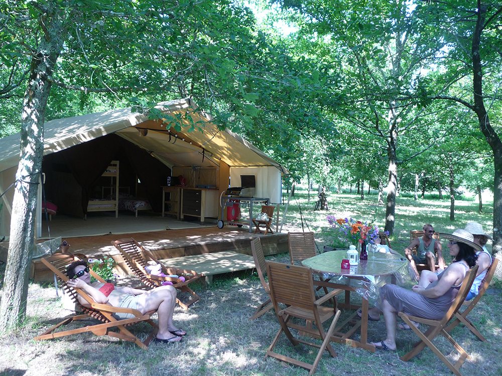 Découvrez la Tente Lodge notre concept d’hébergement au plus près de la nature, les deux tentes se fondent parfaitement dans le grand espace à l’ombre des chênes. On respire sous cette toile couleur sable au plancher de bois surélevé de quelques centimètres du sol ; ça sent le bois et les végétaux environnants. Un compromis entre la tente classique et le chalet : des cloisons faîtes de tissu, le confort des lits ajouté à celui de la cuisine en font un espace qui plait.