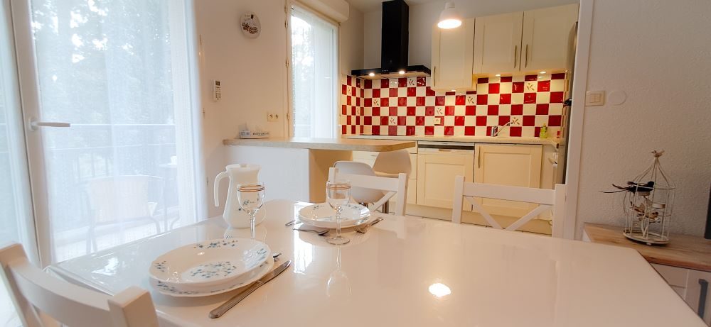 Cuisine ouverte sur l'espace de vie : 4 plaques vitrocéramique, four, micro ondes, réfrigérateur/congélateur, lave vaisselle, cafetière classique, bouilloire, grille pain, tous ustensiles de cuisine et de table. Table, 4 chaises.