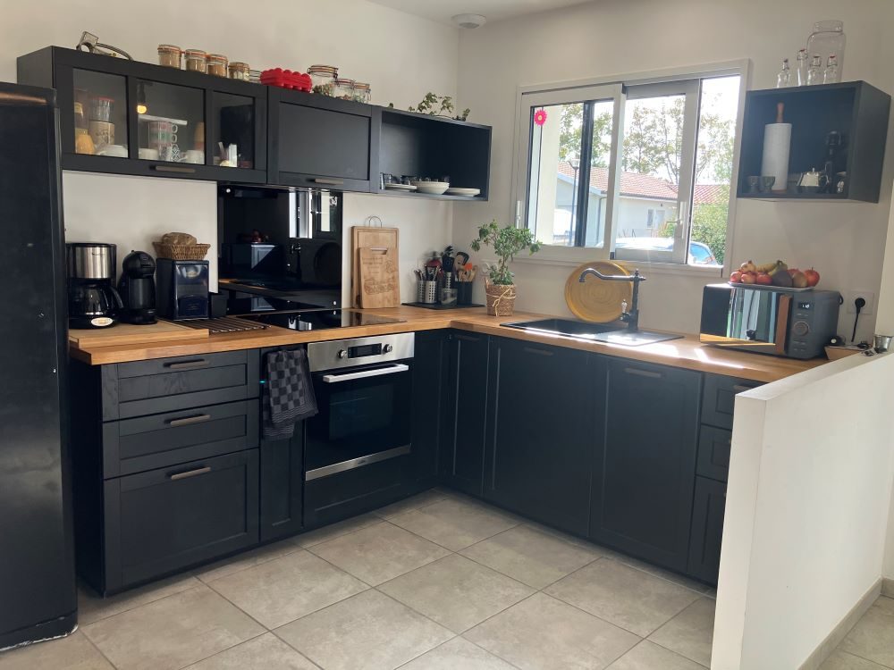 Grande pièce à vivre chaleureuse donnant sur une terrasse de 22 m² avec jardinet clôturé.