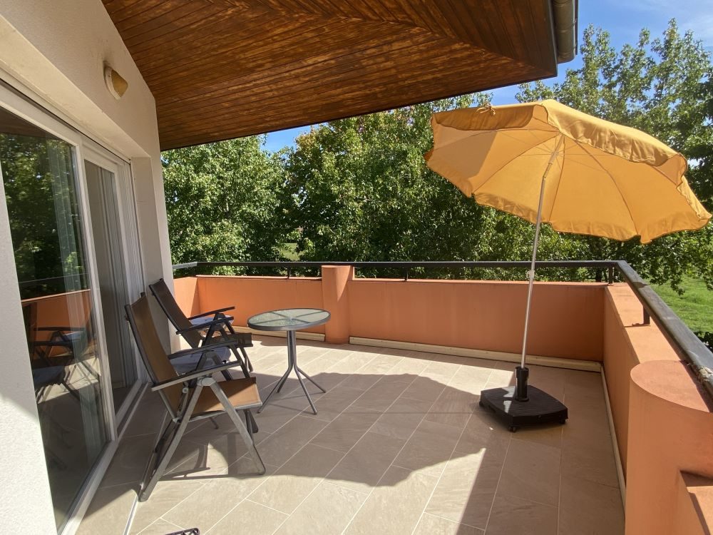 Situé au 2ᵉ et dernier étage avec ascenseur, il offre 2 chambres (dont une avec lit en 160 et TV), un séjour lumineux, une cuisine équipée (cafetière à filtre), une salle d’eau et une grande terrasse de 16 m² , aménagée avec un salon de jardin et parasol, pour profiter de l’extérieur.